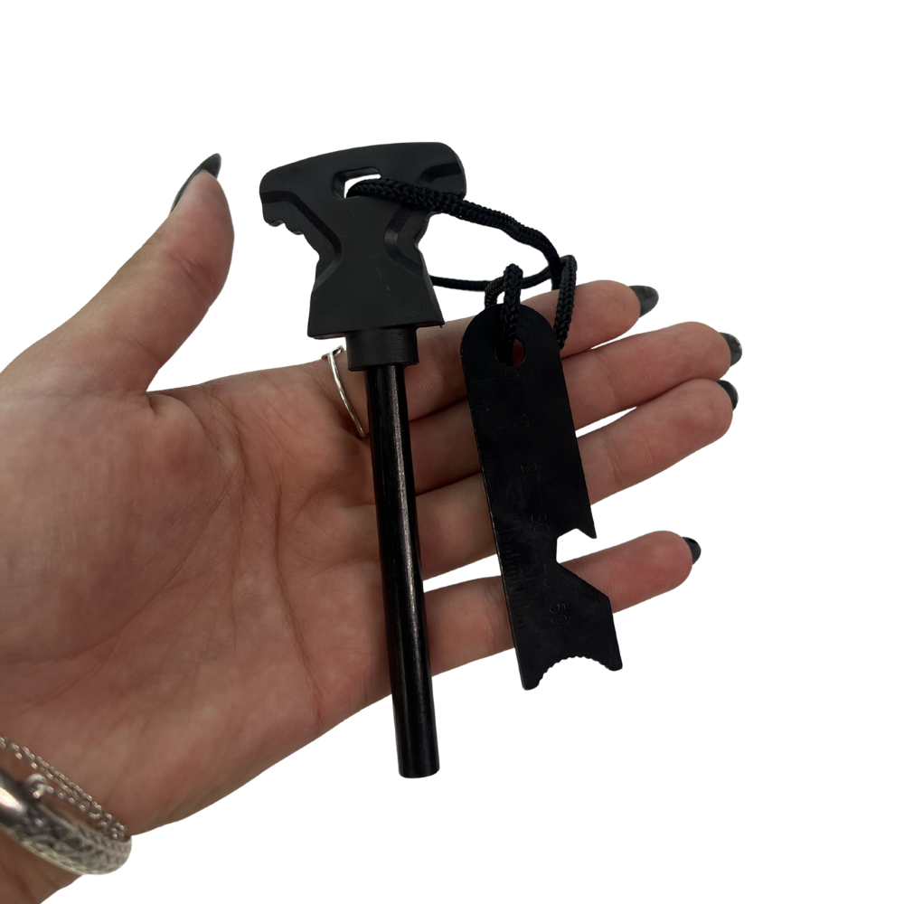 - Acompanha: Kit pederneira (isqueiro de sobrevivência) com apito de emergência