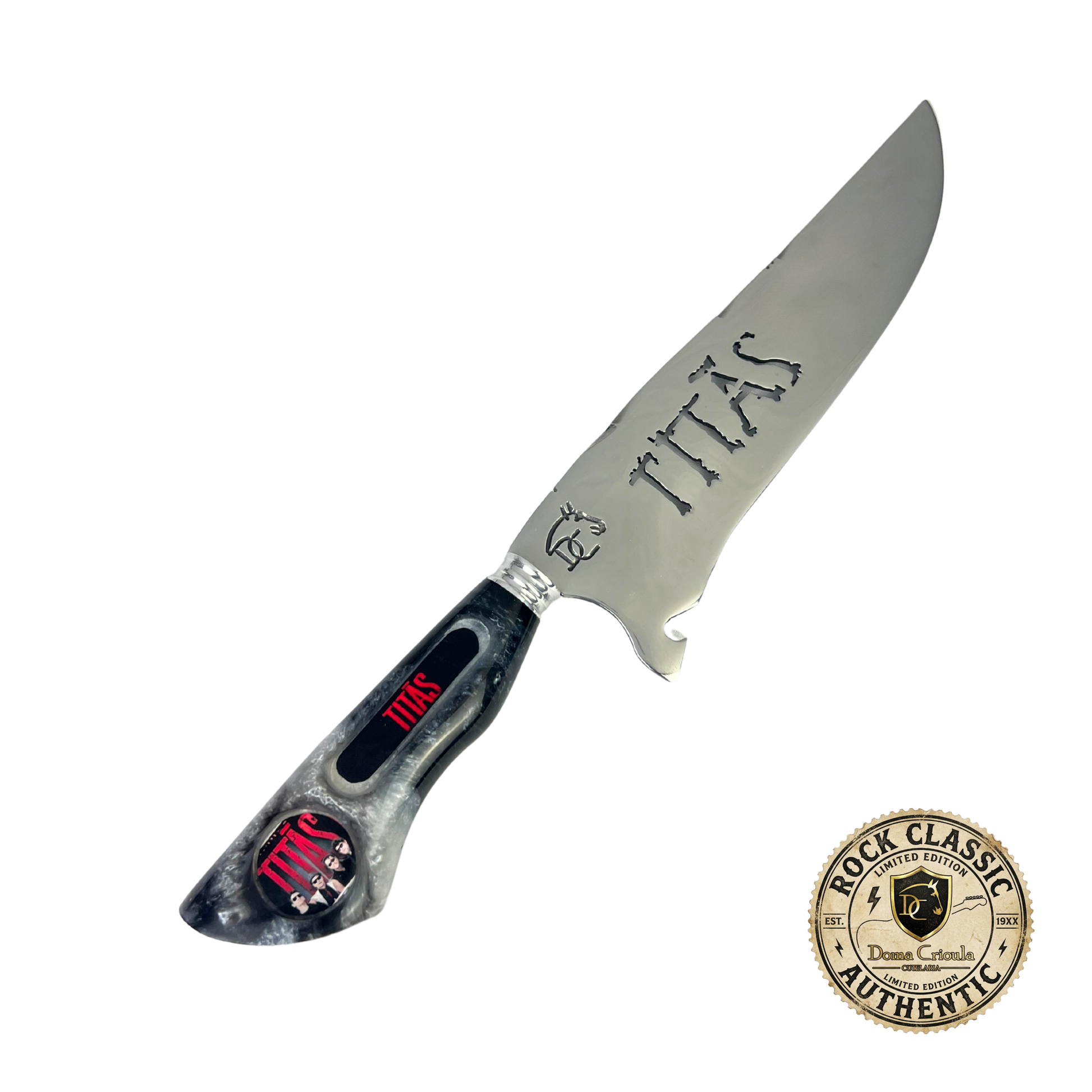 Ideal para colecionadores de cutelaria temática rock brasileiro, fãs dos Titãs e apreciadores de churrasco que buscam peças exclusivas com identidade nacional. Perfeita para exibição em coleções, uso em churrascos especiais ou como presente premium para amantes do rock nacional.