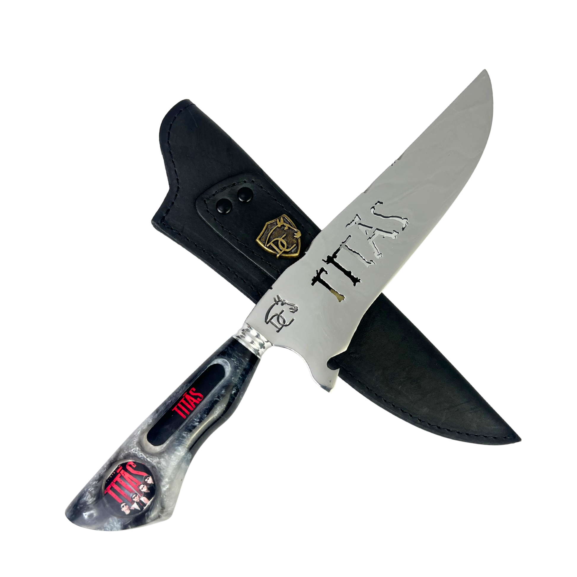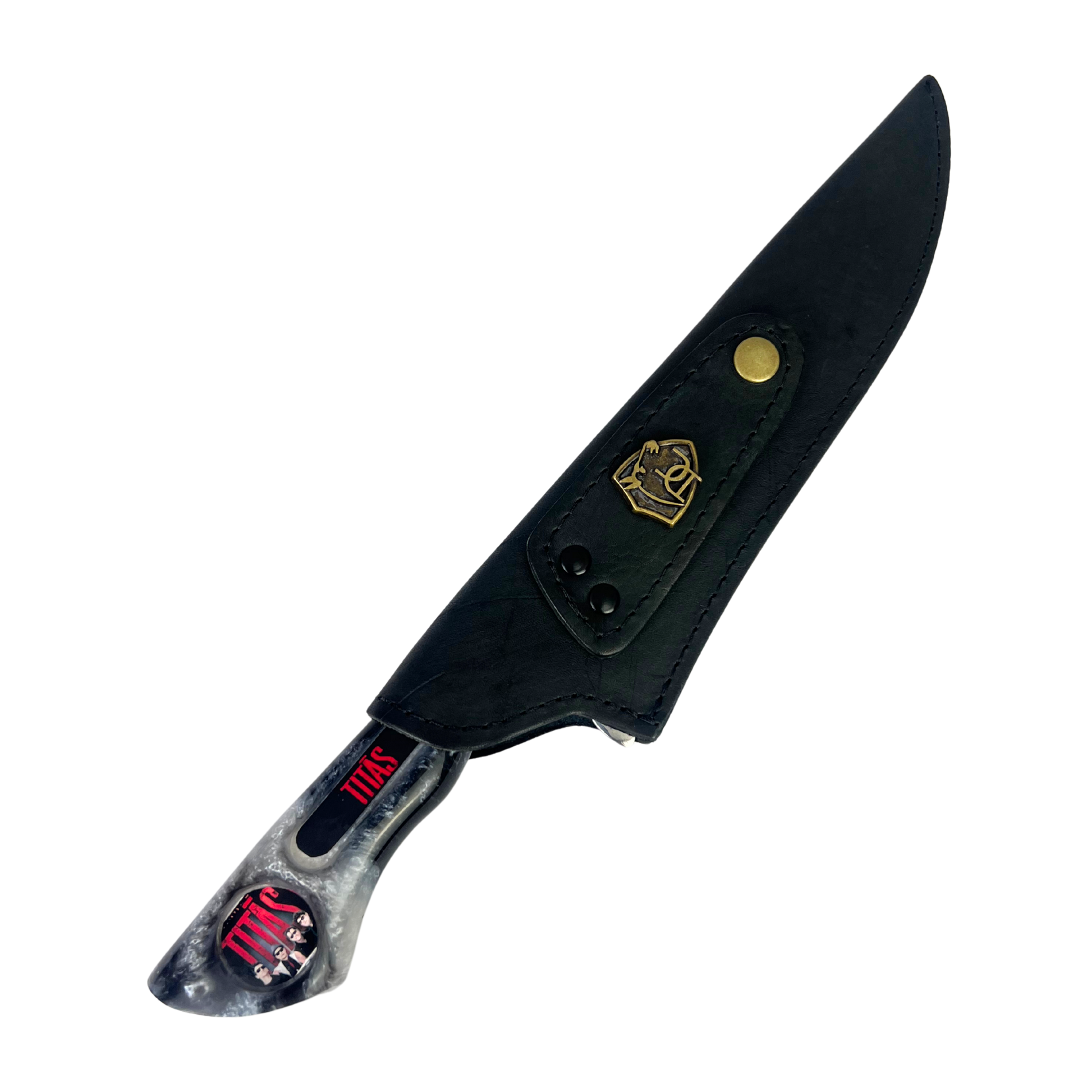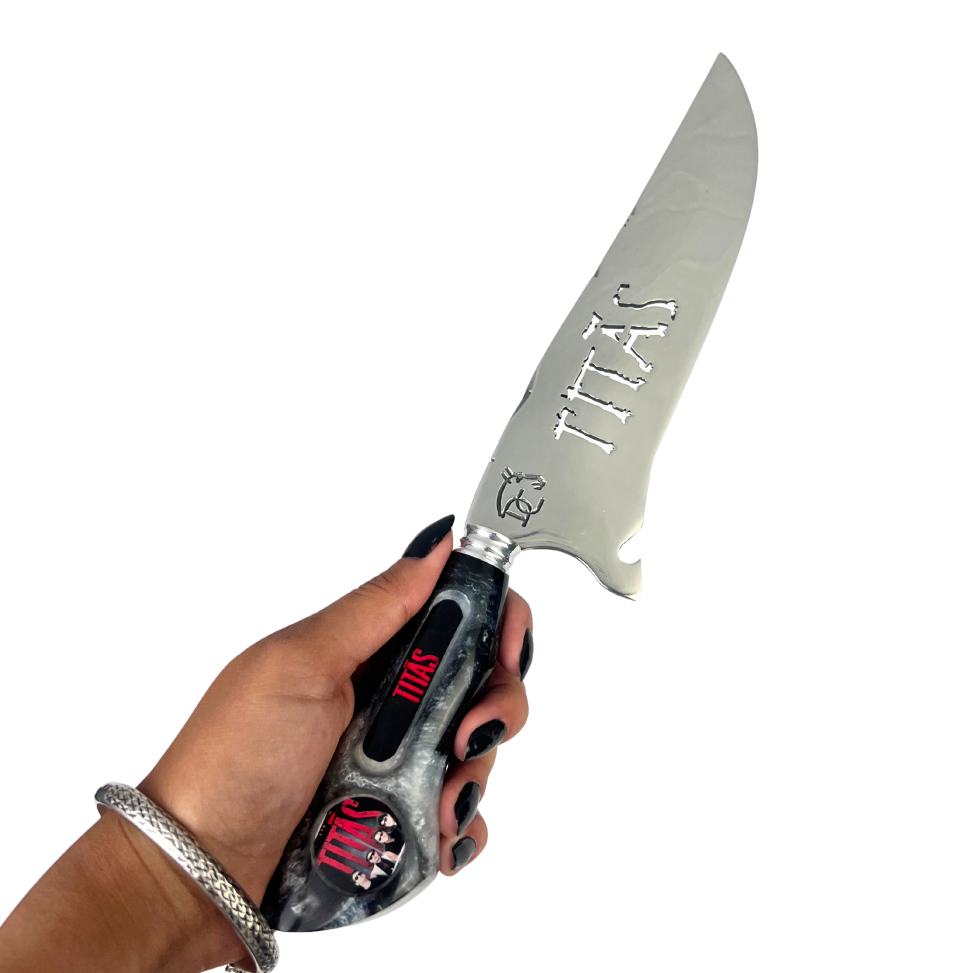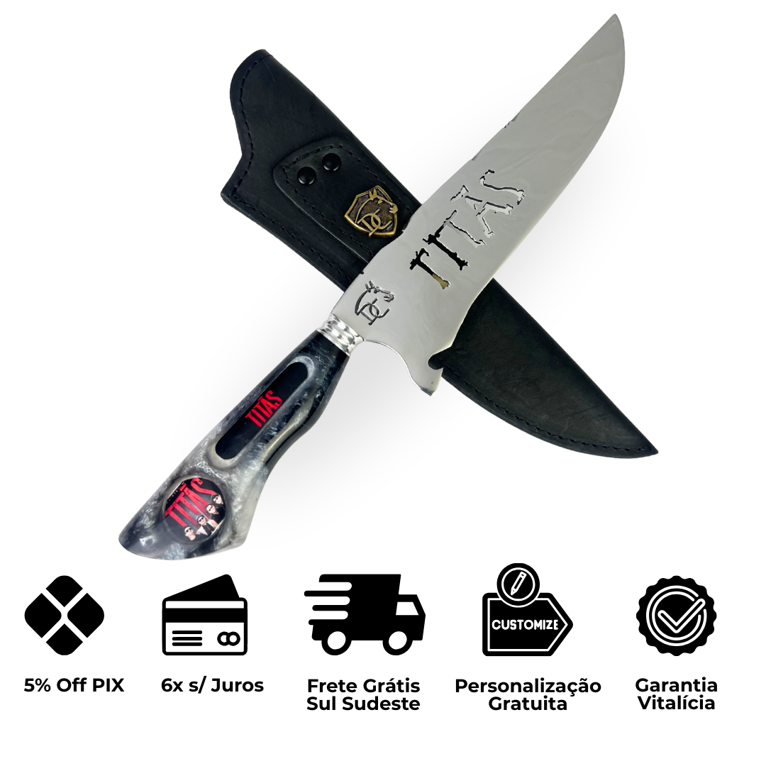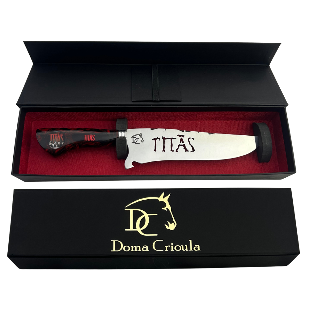 Sua lâmina de 8 polegadas com vazado temático exibe o icônico logo Titãs em alto relevo, enquanto o cabo em resina marmorizada apresenta um padrão único que mistura preto, cinza e detalhes vermelhos, criando uma peça exclusiva e irrepetível. O visual elegante e agressivo reflete perfeitamente a essência da banda que marcou gerações.