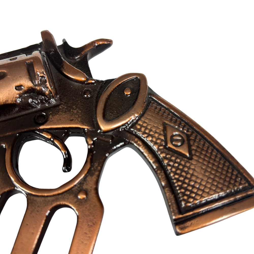 - Garra em formato de revólver com acabamento bronze/cobre