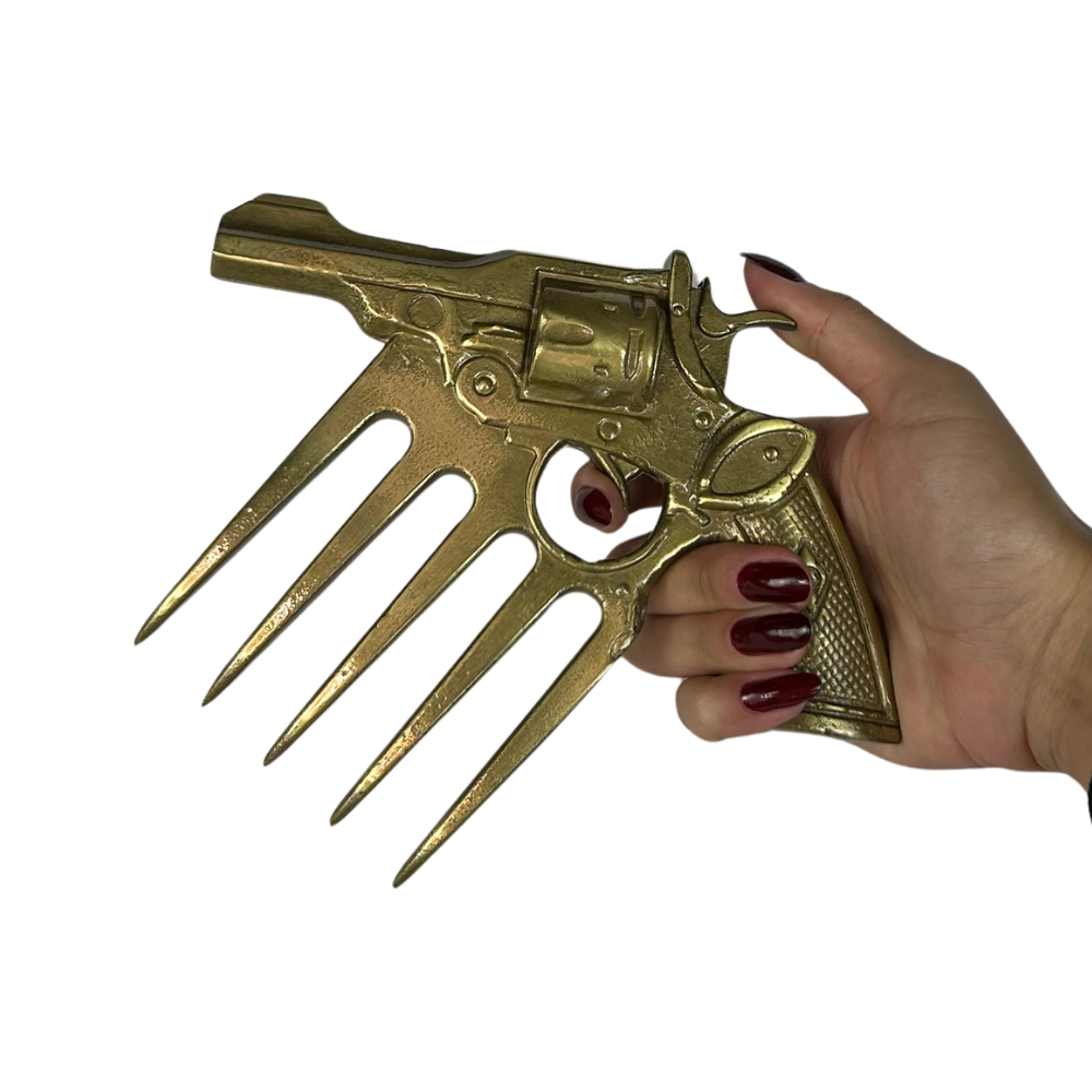 A garra possui design icônico em formato de revólver com detalhes realistas que impressionam. O tambor, gatilho, cão e coronha texturizada são reproduzidos com precisão artesanal. As 4 garras afiadas substituem o cano do revólver, criando uma peça funcional e decorativa ao mesmo tempo. O design permite que a garra seja empunhada como um revólver, proporcionando pegada confortável e segura.