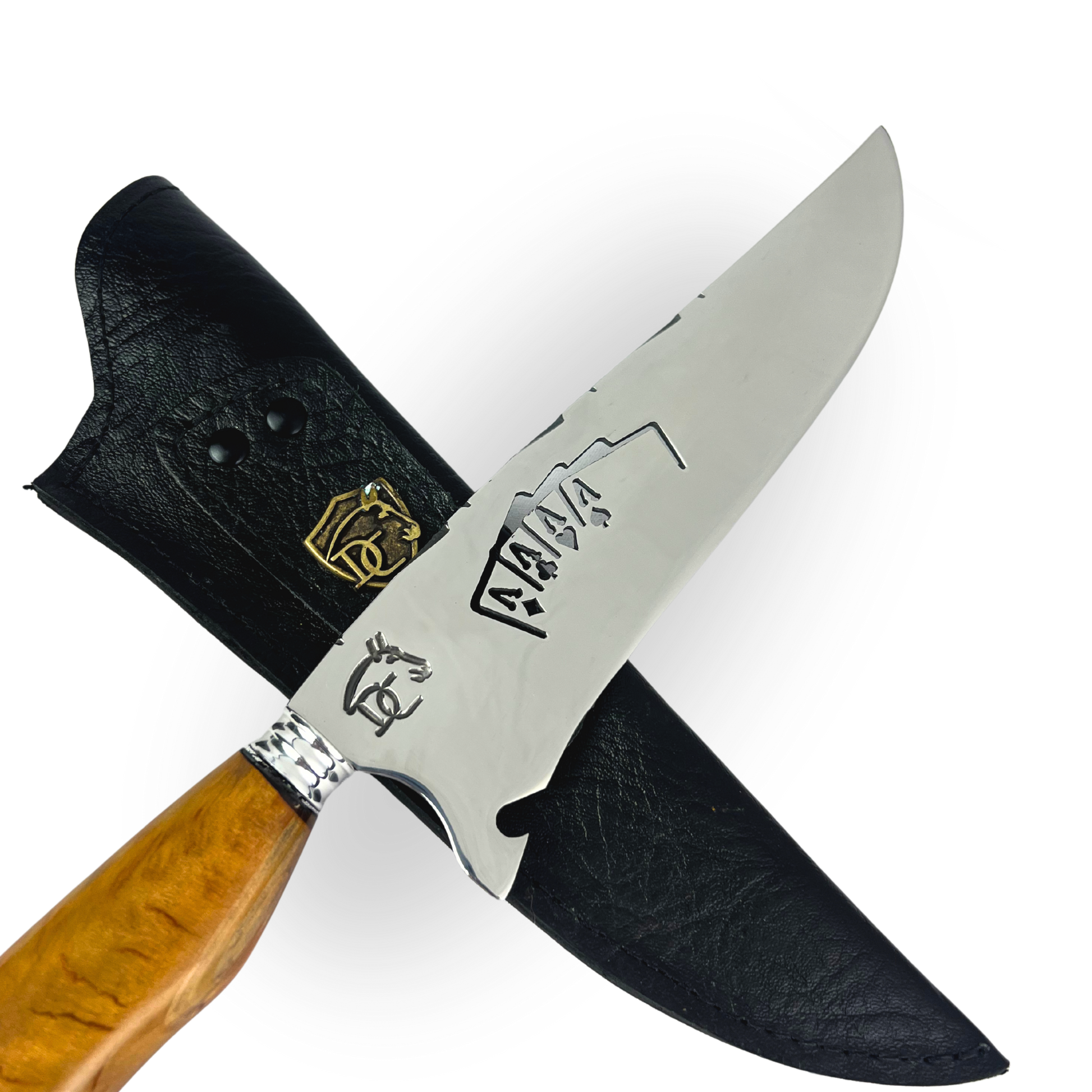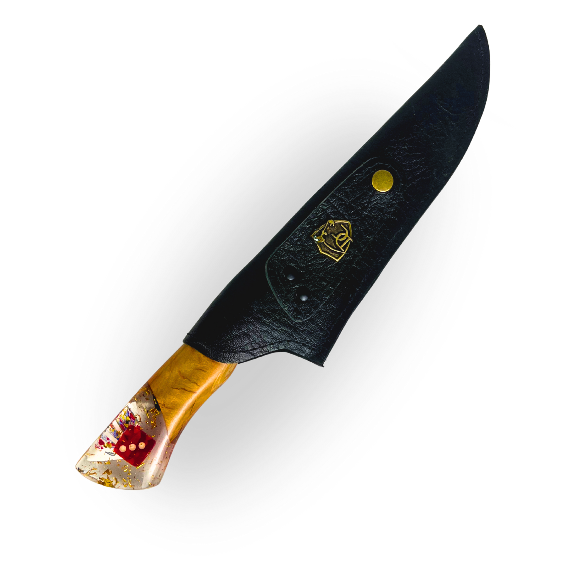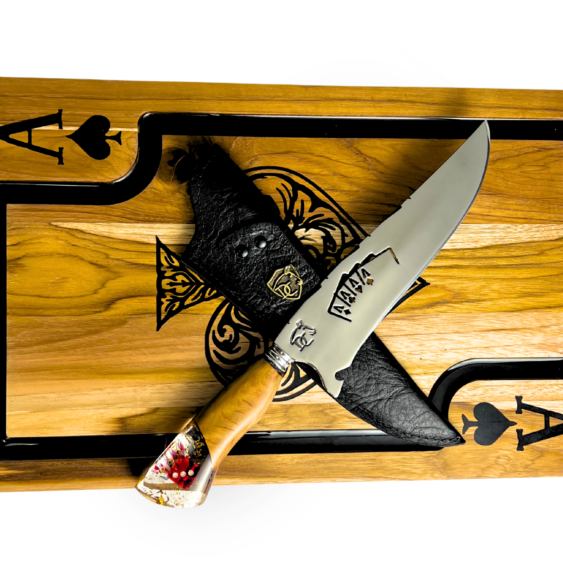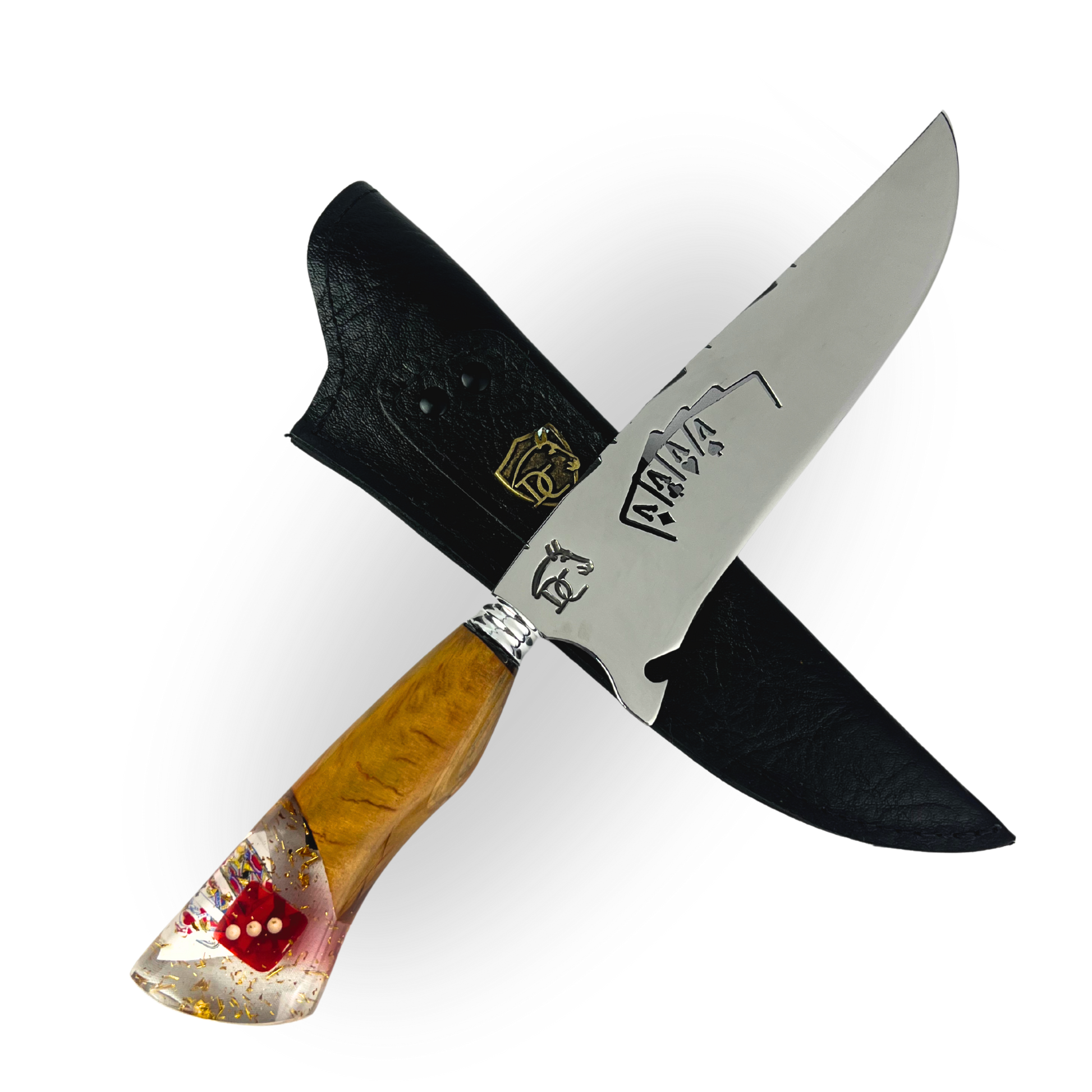- ✅ Faca Artesanal 8 Polegadas: Lâmina com vazado de cartas, cabo nó de pinho com resina e pingente de cartas e dado