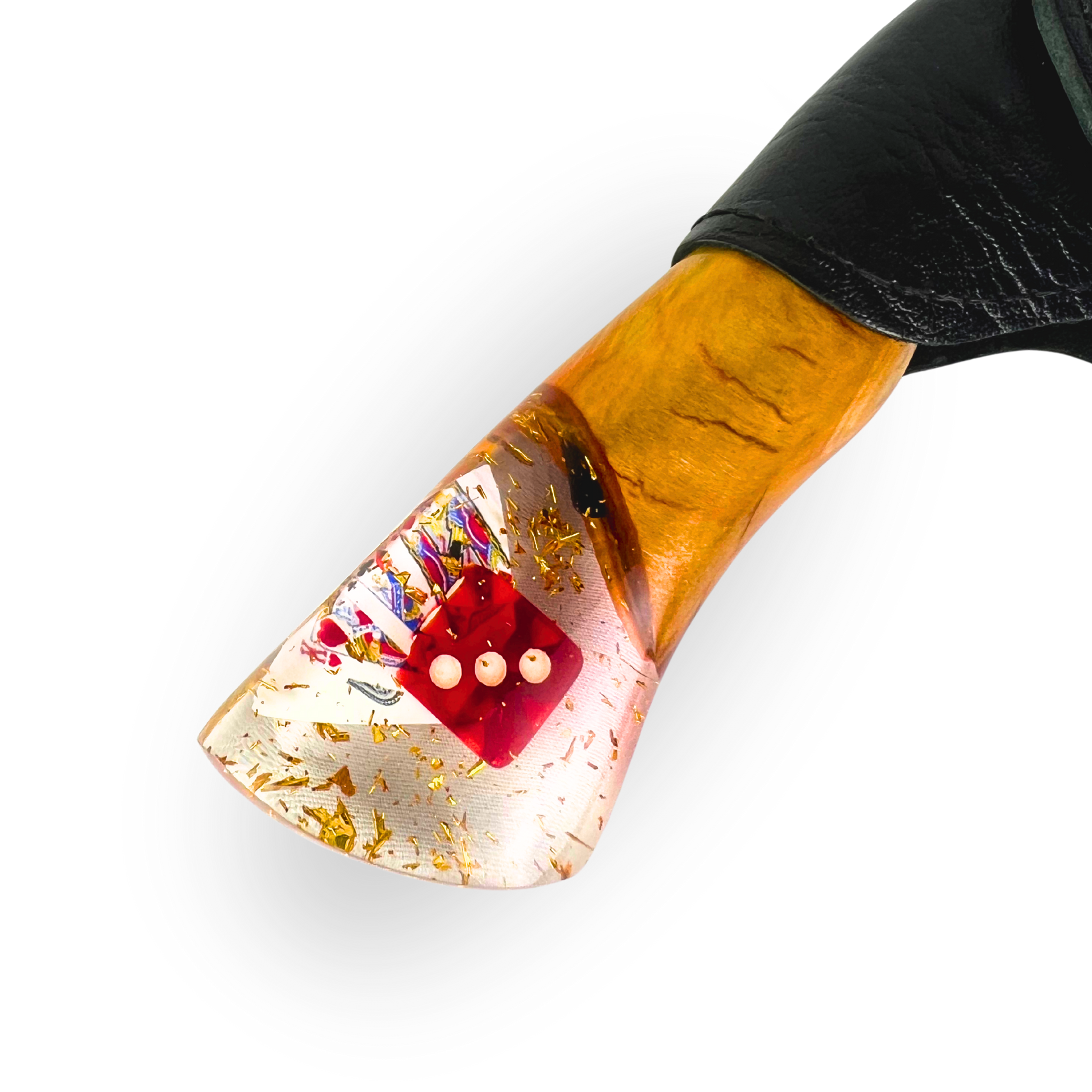 Cada elemento deste kit foi pensado para criar uma experiência completa. A resina preta nos detalhes da tábua, o vazado de cartas na lâmina, o pingente de dado e cartas no cabo - tudo se conecta para contar uma história de estilo, personalidade e bom gosto.