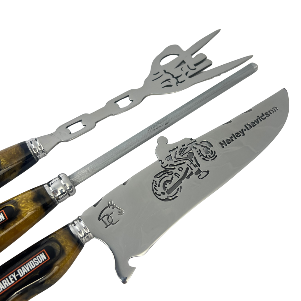 Kit completo para churrasco com 3 peças artesanais, combinando a tradição gaúcha com o espírito da estrada. Cada peça é forjada com precisão e personalizada com a icônica marca Harley-Davidson.