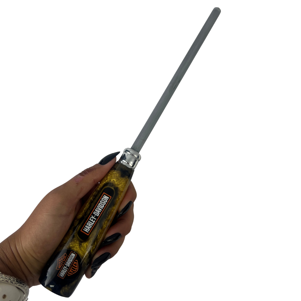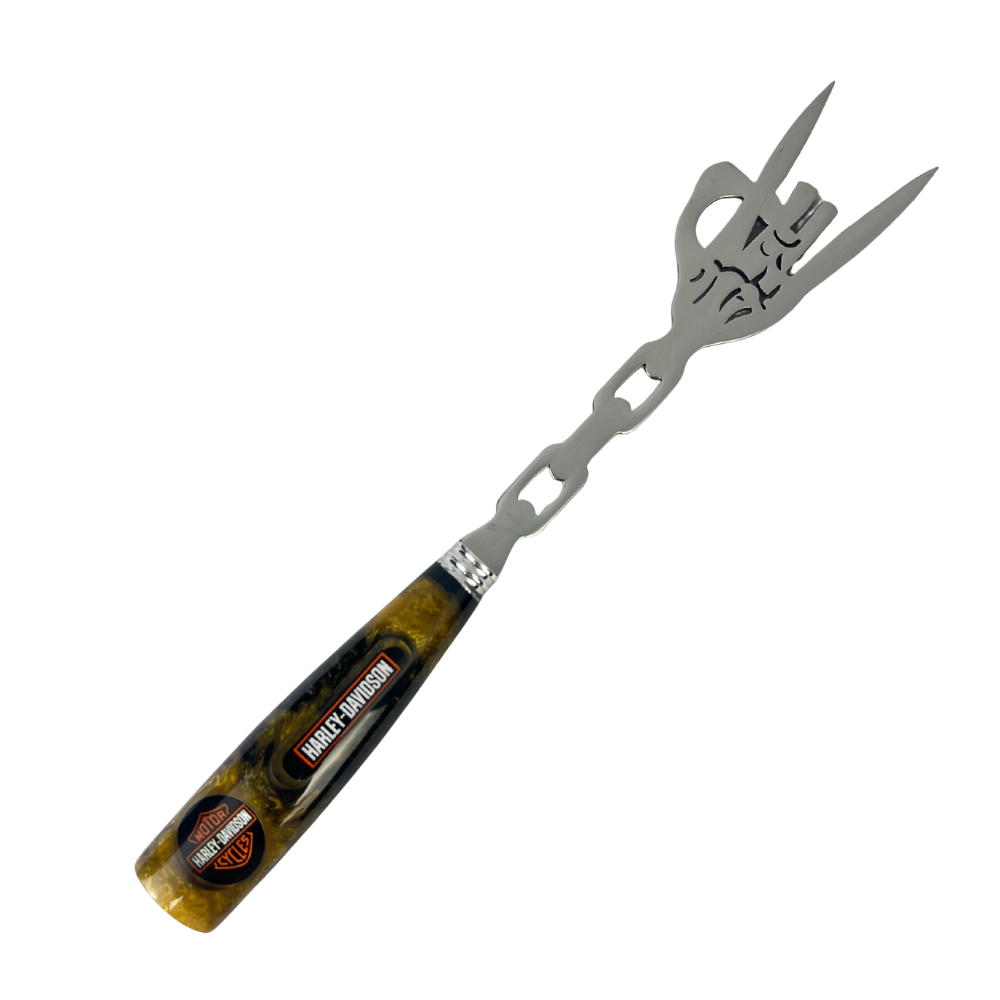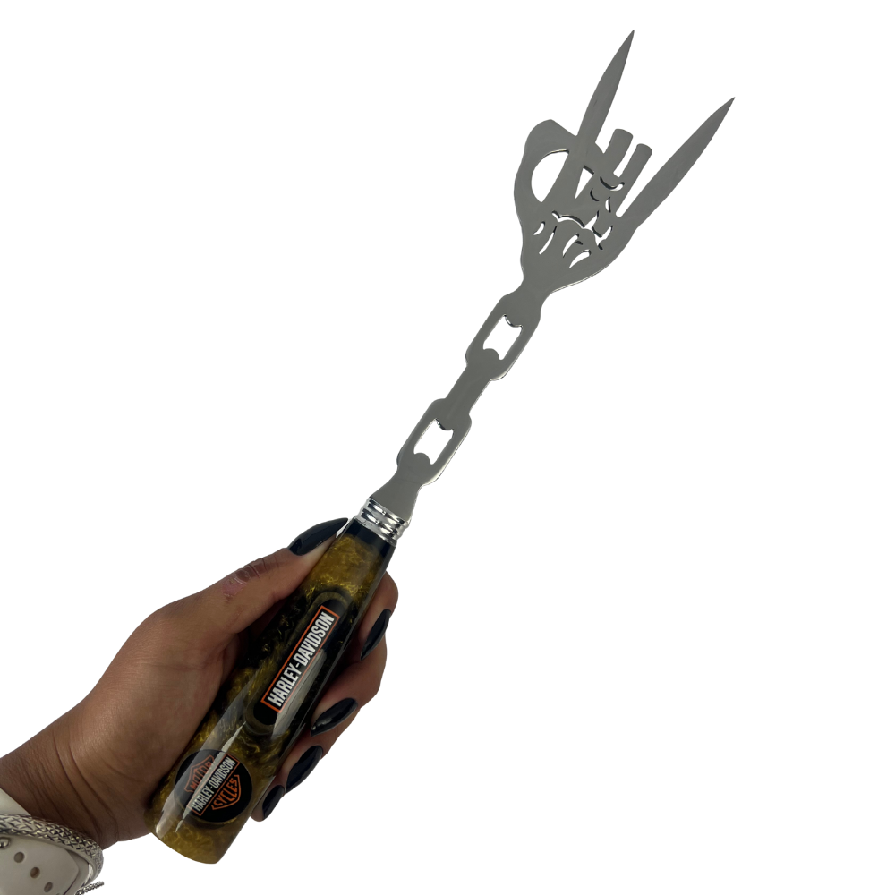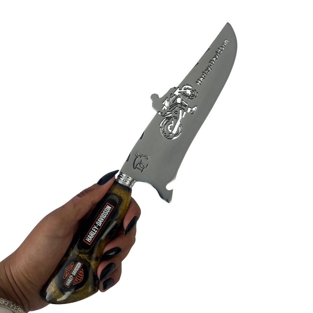 Peças artesanais de alta qualidade, perfeitas para motociclistas e churrasqueiros que valorizam exclusividade e atitude. O cabo em resina oferece excelente pegada e durabilidade, enquanto a personalização Harley-Davidson traz personalidade única ao seu kit.