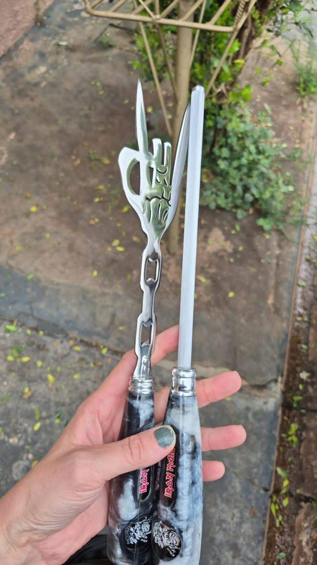 Kit com 2 peças artesanais para churrasco, unindo tradição gaúcha e a energia do rock. Cada peça é forjada com precisão e personalizada com a icônica marca Iron Maiden.