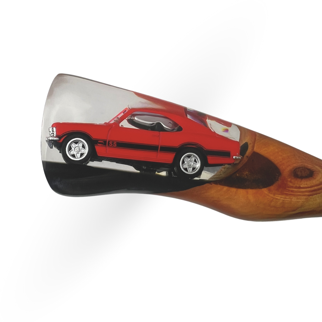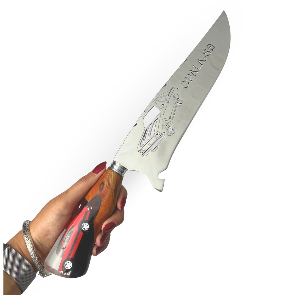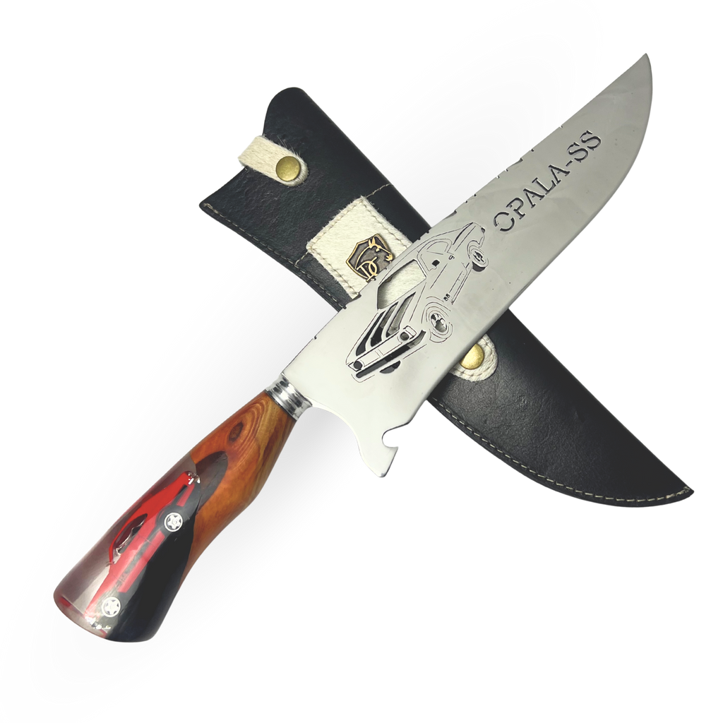 O cabo apresenta uma combinação sofisticada de madeira natural com resina e uma mini Opala em opalina embutida, criando um efeito visual impressionante e único. A gravação do Opala fazado na lâmina reforça a temática automotiva desta peça especial.